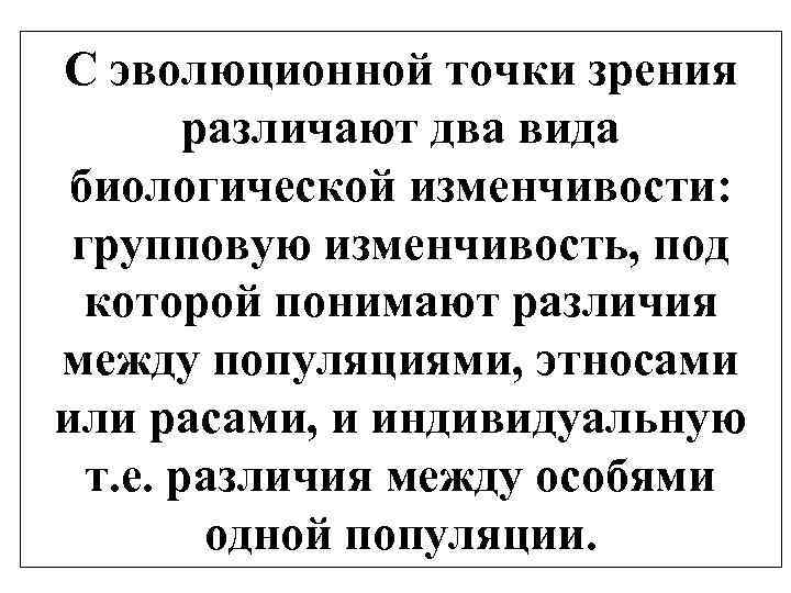 С эволюционной точки зрения различают два вида биологической изменчивости: групповую изменчивость, под которой понимают различия между популяциями, этносами или расами, и индивидуальную т. е. различия между особями одной популяции.