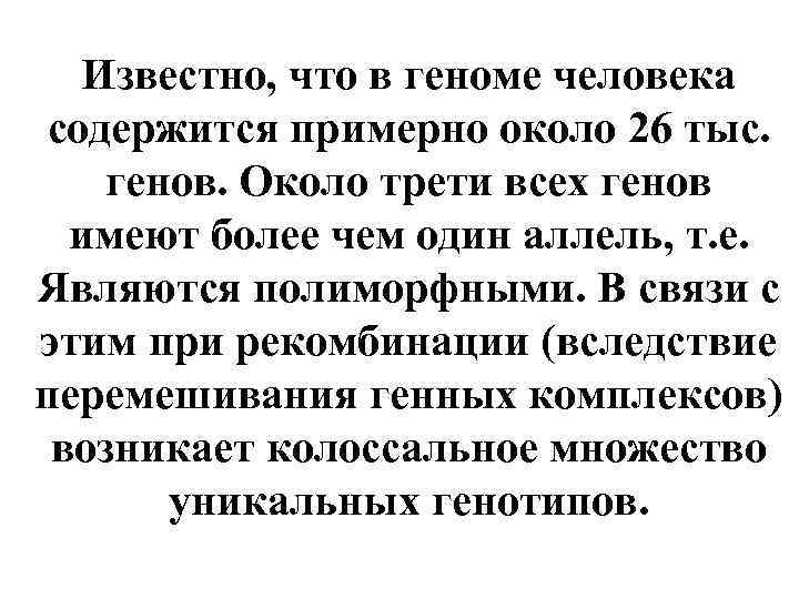 Известно, что в геноме человека содержится примерно около 26 тыс. генов. Около трети всех генов имеют более чем один аллель, т. е. Являются полиморфными. В связи с этим при рекомбинации (вследствие перемешивания генных комплексов) возникает колоссальное множество уникальных генотипов.