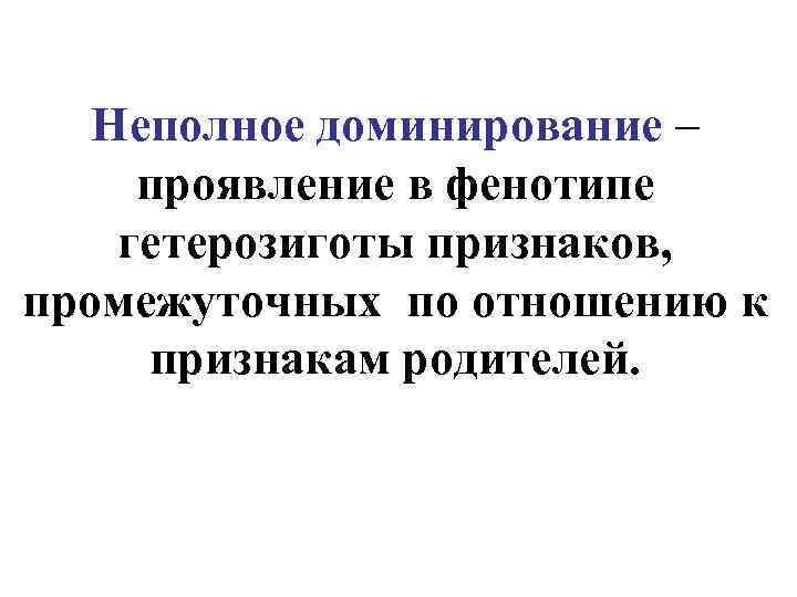 Неполное доминирование – проявление в фенотипе гетерозиготы признаков, промежуточных по отношению к признакам родителей.