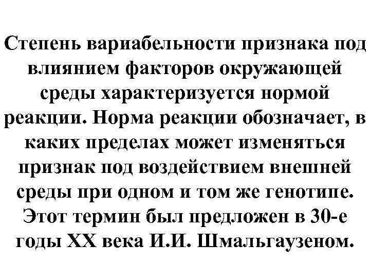Степень вариабельности признака под влиянием факторов окружающей среды характеризуется нормой реакции. Норма реакции обозначает, в каких пределах может изменяться признак под воздействием внешней среды при одном и том же генотипе. Этот термин был предложен в 30 -е годы ХХ века И. И. Шмальгаузеном.