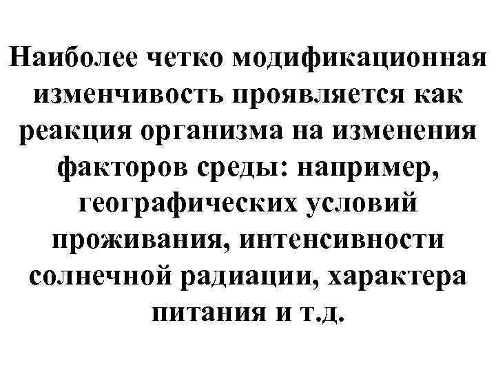 Наиболее четко модификационная изменчивость проявляется как реакция организма на изменения факторов среды: например, географических условий проживания, интенсивности солнечной радиации, характера питания и т. д.