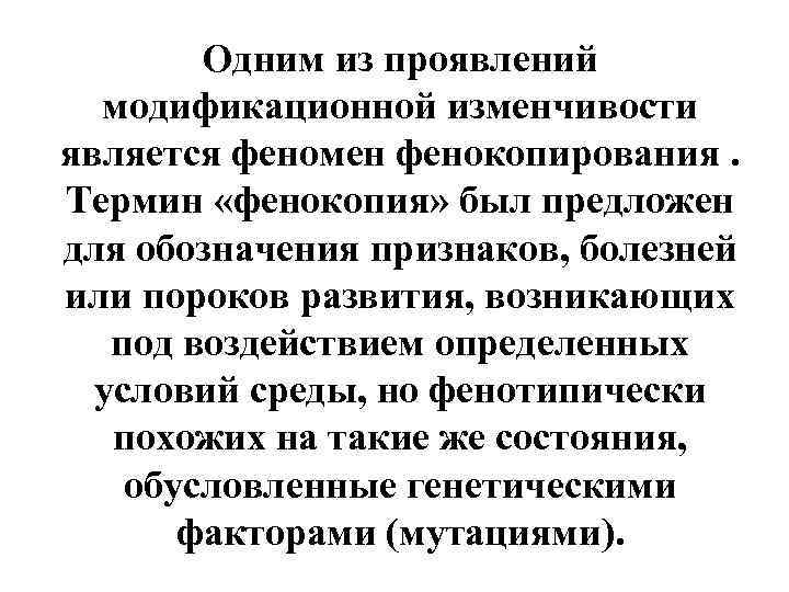 Одним из проявлений модификационной изменчивости является феномен фенокопирования. Термин «фенокопия» был предложен для обозначения признаков, болезней или пороков развития, возникающих под воздействием определенных условий среды, но фенотипически похожих на такие же состояния, обусловленные генетическими факторами (мутациями).