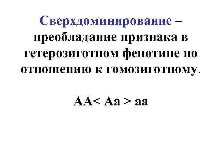Сверхдоминирование – преобладание признака в гетерозиготном фенотипе по отношению к гомозиготному. АА< Аа > аа