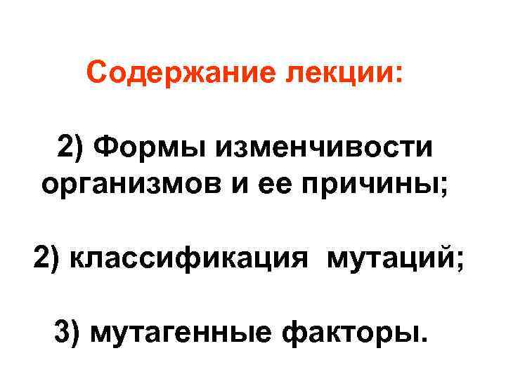Содержание лекции: 2) Формы изменчивости организмов и ее причины; 2) классификация мутаций; 3) мутагенные факторы.