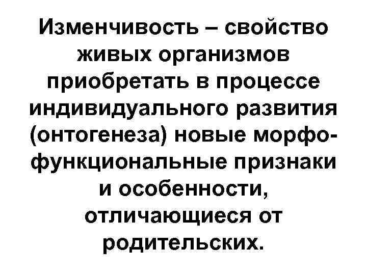 Изменчивость – свойство живых организмов приобретать в процессе индивидуального развития (онтогенеза) новые морфофункциональные признаки и особенности, отличающиеся от родительских.