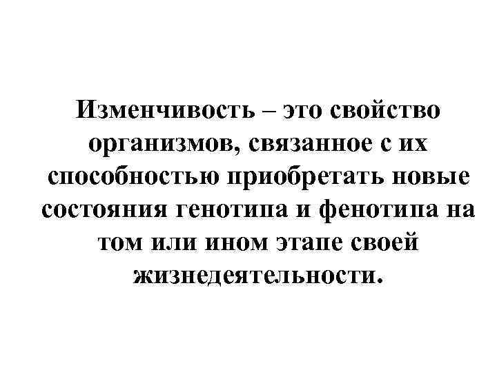 Изменчивость – это свойство организмов, связанное с их способностью приобретать новые состояния генотипа и фенотипа на том или ином этапе своей жизнедеятельности.