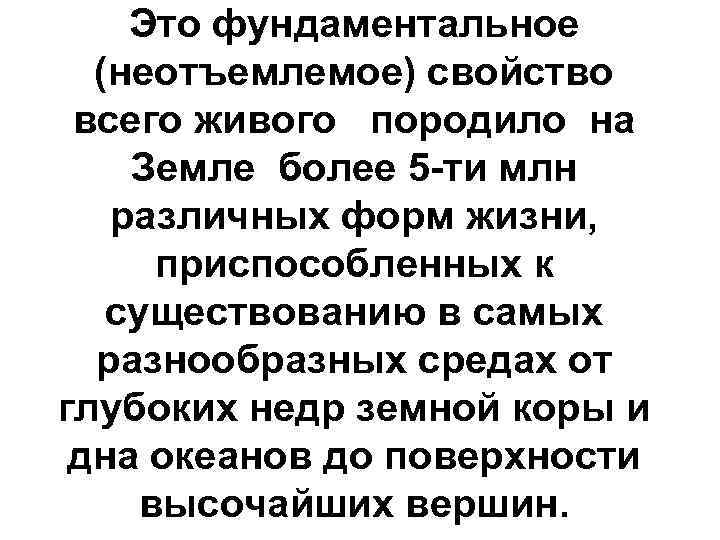 Это фундаментальное (неотъемлемое) свойство всего живого породило на Земле более 5 -ти млн различных форм жизни, приспособленных к существованию в самых разнообразных средах от глубоких недр земной коры и дна океанов до поверхности высочайших вершин.