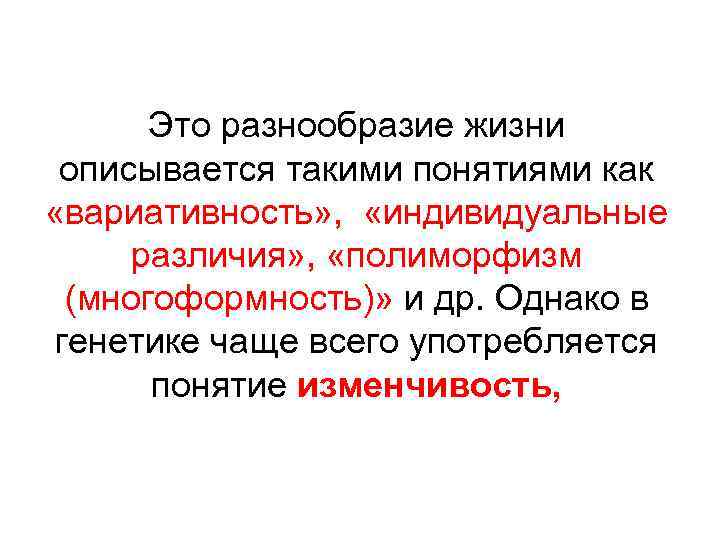 Это разнообразие жизни описывается такими понятиями как «вариативность» , «индивидуальные различия» , «полиморфизм (многоформность)» и др. Однако в генетике чаще всего употребляется понятие изменчивость,