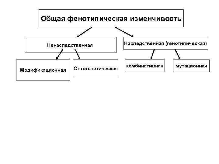 Общая фенотипическая изменчивость Ненаследственная Модификационная Онтогенетическая Наследственная (генотипическая) комбинативная мутационная