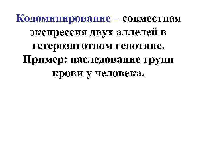 Кодоминирование – совместная экспрессия двух аллелей в гетерозиготном генотипе. Пример: наследование групп крови у человека.