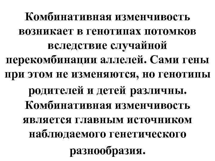 Комбинативная изменчивость возникает в генотипах потомков вследствие случайной перекомбинации аллелей. Сами гены при этом не изменяются, но генотипы родителей и детей различны. Комбинативная изменчивость является главным источником наблюдаемого генетического разнообразия.