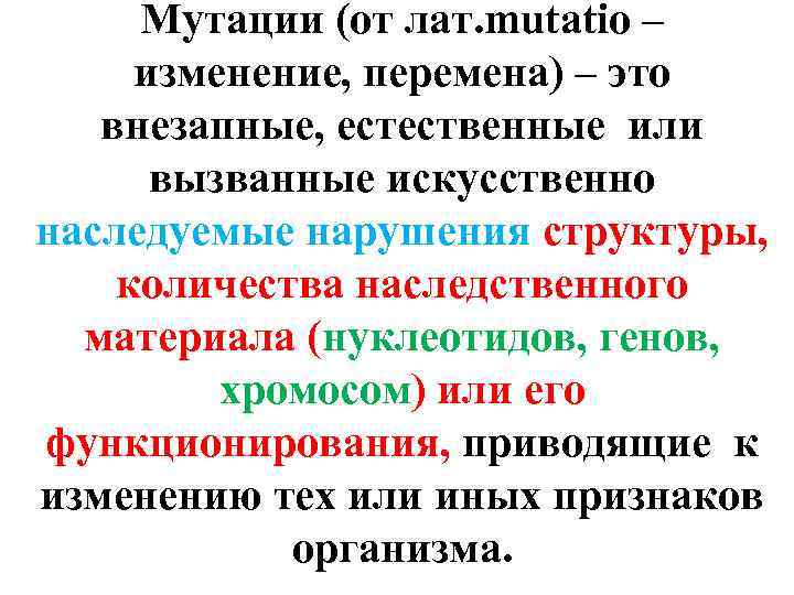 Мутации (от лат. mutatio – изменение, перемена) – это внезапные, естественные или вызванные искусственно наследуемые нарушения структуры, количества наследственного материала (нуклеотидов, генов, хромосом) или его функционирования, приводящие к изменению тех или иных признаков организма.