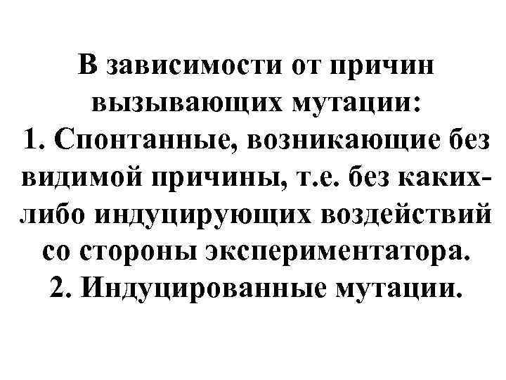 В зависимости от причин вызывающих мутации: 1. Спонтанные, возникающие без видимой причины, т. е. без какихлибо индуцирующих воздействий со стороны экспериментатора. 2. Индуцированные мутации.