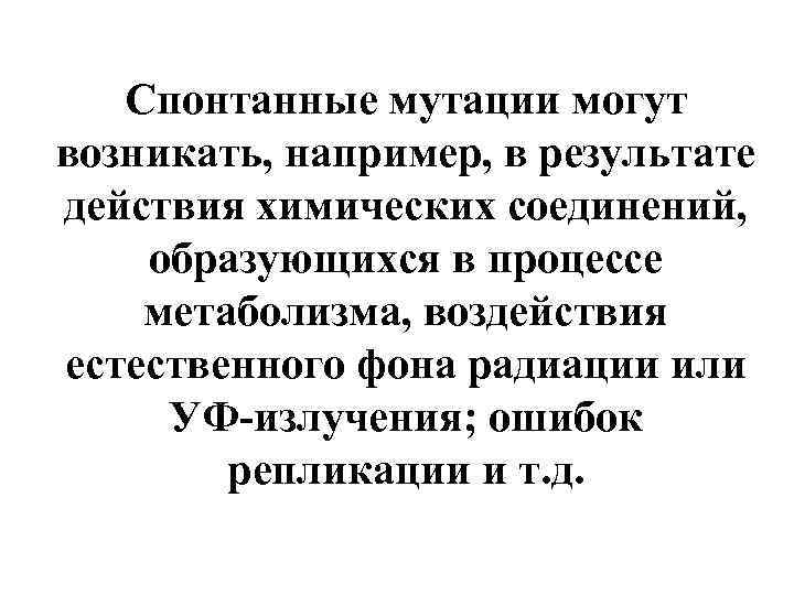 Спонтанные мутации могут возникать, например, в результате действия химических соединений, образующихся в процессе метаболизма, воздействия естественного фона радиации или УФ-излучения; ошибок репликации и т. д.
