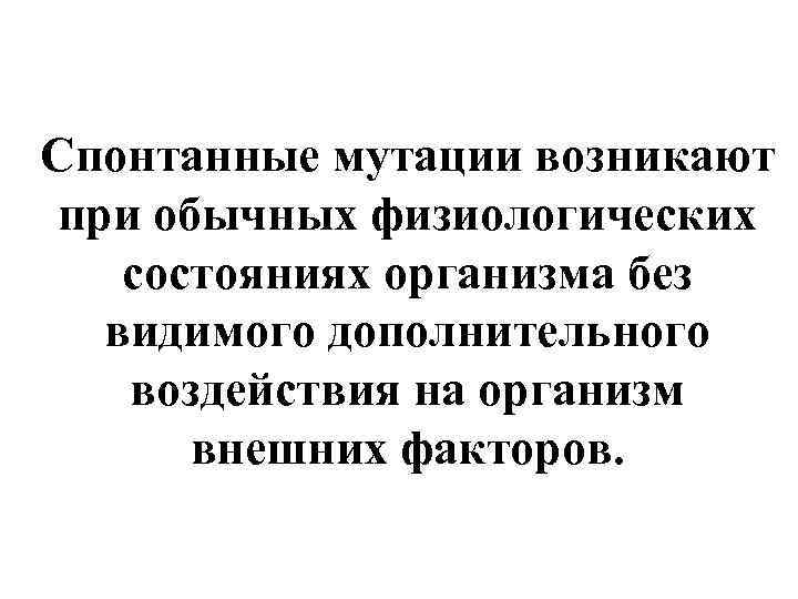 Спонтанные мутации возникают при обычных физиологических состояниях организма без видимого дополнительного воздействия на организм внешних факторов.