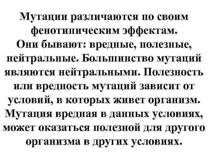 Мутации различаются по своим фенотипическим эффектам. Они бывают: вредные, полезные, нейтральные. Большинство мутаций являются нейтральными. Полезность или вредность мутаций зависит от условий, в которых живет организм. Мутация вредная в данных условиях, может оказаться полезной для другого организма в других условиях.