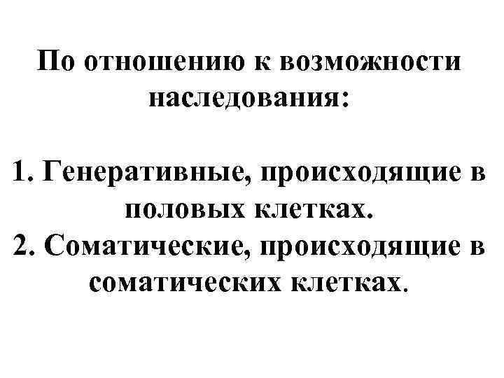 По отношению к возможности наследования: 1. Генеративные, происходящие в половых клетках. 2. Соматические, происходящие в соматических клетках.