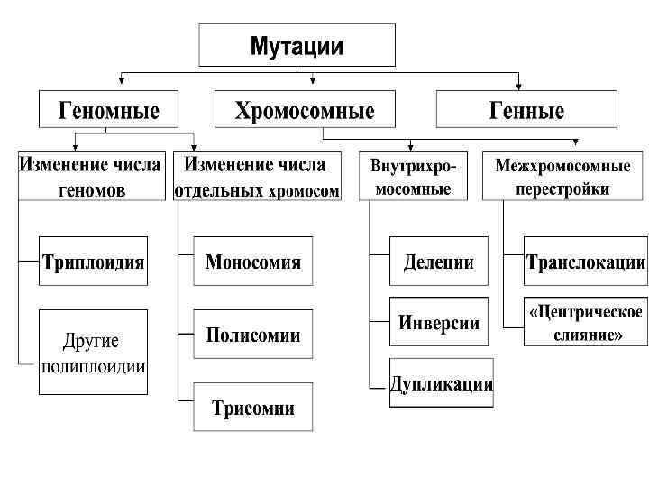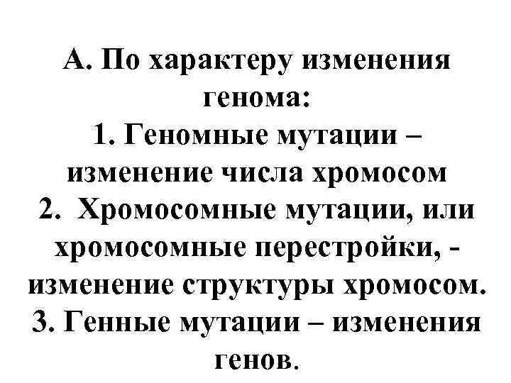 А. По характеру изменения генома: 1. Геномные мутации – изменение числа хромосом 2. Хромосомные мутации, или хромосомные перестройки, - изменение структуры хромосом. 3. Генные мутации – изменения генов.