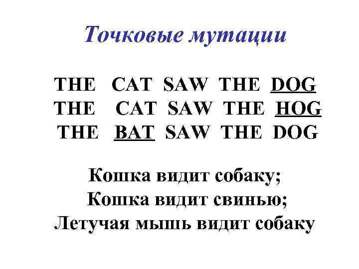 Точковые мутации THE CAT SAW THE DOG THE CAT SAW THE HOG THE BAT SAW THE DOG Кошка видит собаку; Кошка видит свинью; Летучая мышь видит собаку