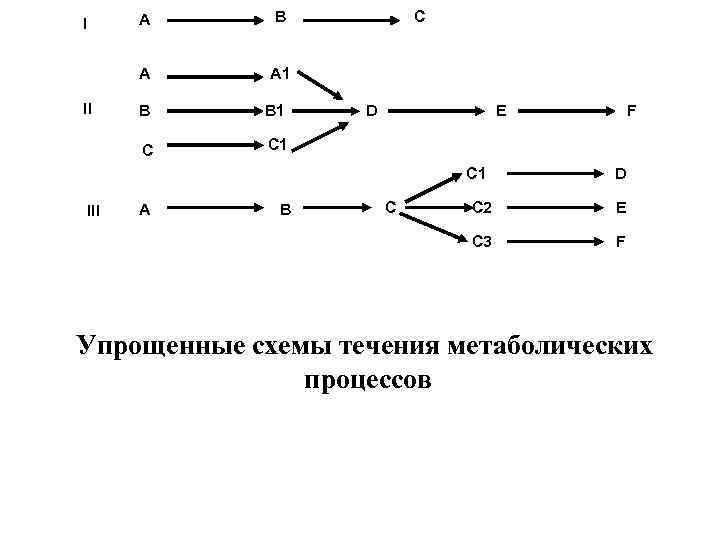 II А В А I А 1 В В 1 С С D E С 1 D А В С 2 E С 3 III С F F Упрощенные схемы течения метаболических процессов