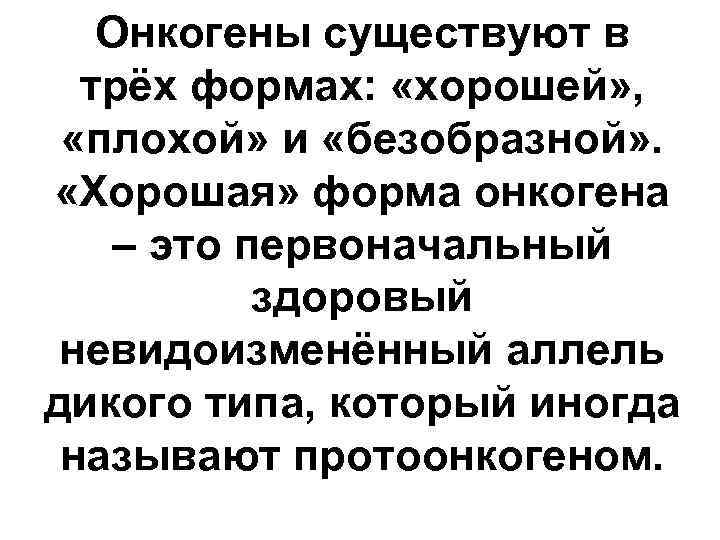 Онкогены существуют в трёх формах: «хорошей» , «плохой» и «безобразной» . «Хорошая» форма онкогена – это первоначальный здоровый невидоизменённый аллель дикого типа, который иногда называют протоонкогеном.