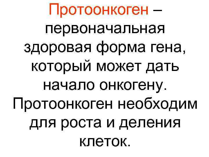 Протоонкоген – первоначальная здоровая форма гена, который может дать начало онкогену. Протоонкоген необходим для роста и деления клеток.
