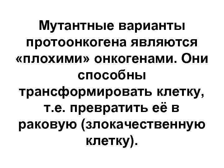 Мутантные варианты протоонкогена являются «плохими» онкогенами. Они способны трансформировать клетку, т. е. превратить её в раковую (злокачественную клетку).