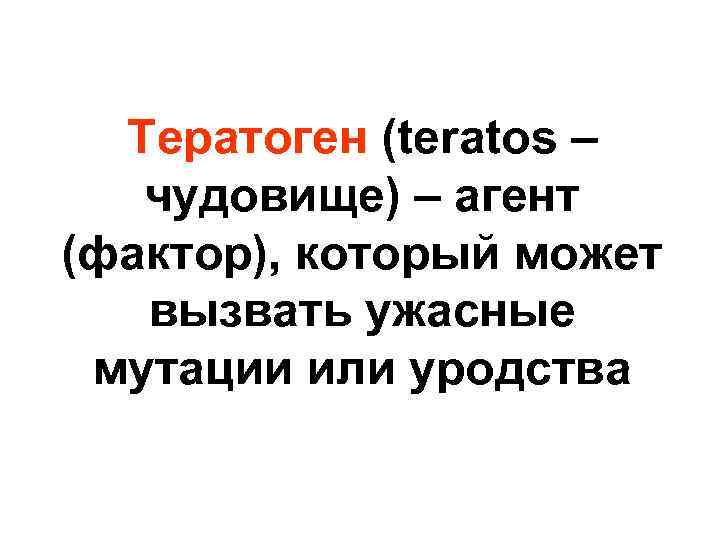 Тератоген (teratos – чудовище) – агент (фактор), который может вызвать ужасные мутации или уродства