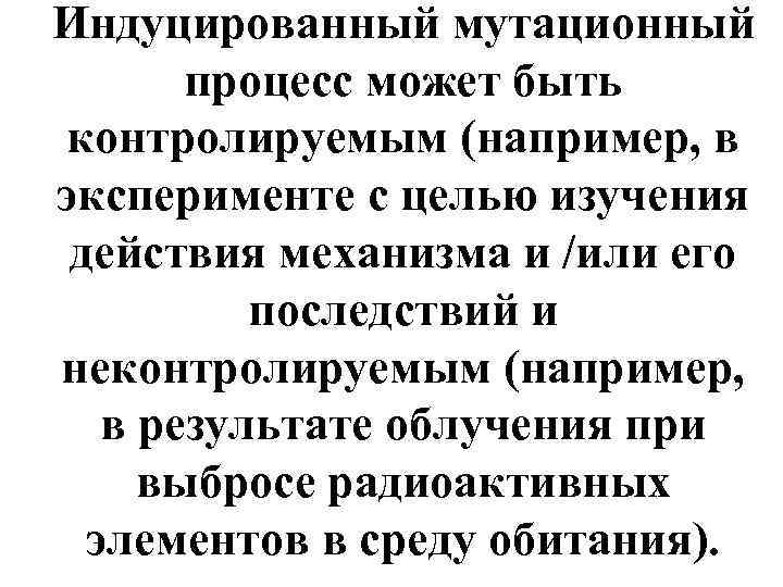 Индуцированный мутационный процесс может быть контролируемым (например, в эксперименте с целью изучения действия механизма и /или его последствий и неконтролируемым (например, в результате облучения при выбросе радиоактивных элементов в среду обитания).