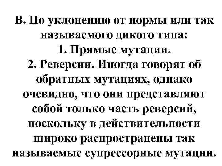 В. По уклонению от нормы или так называемого дикого типа: 1. Прямые мутации. 2. Реверсии. Иногда говорят об обратных мутациях, однако очевидно, что они представляют собой только часть реверсий, поскольку в действительности широко распространены так называемые супрессорные мутации.
