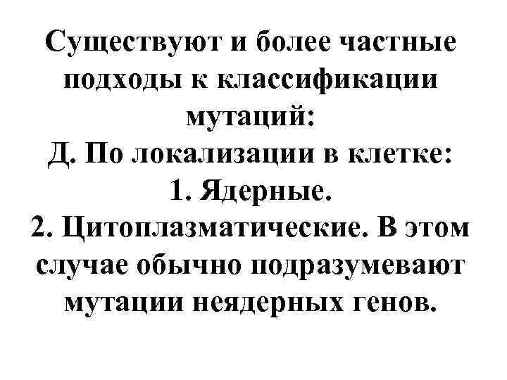 Существуют и более частные подходы к классификации мутаций: Д. По локализации в клетке: 1. Ядерные. 2. Цитоплазматические. В этом случае обычно подразумевают мутации неядерных генов.