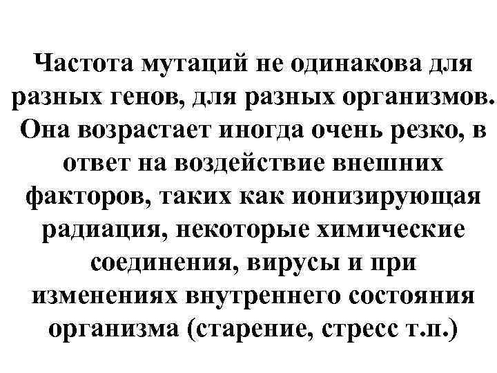 Частота мутаций не одинакова для разных генов, для разных организмов. Она возрастает иногда очень резко, в ответ на воздействие внешних факторов, таких как ионизирующая радиация, некоторые химические соединения, вирусы и при изменениях внутреннего состояния организма (старение, стресс т. п. )