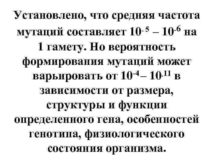 Установлено, что средняя частота мутаций составляет 10 - 5 – 10 -6 на 1 гамету. Но вероятность формирования мутаций может варьировать от 10 -4 – 10 11 в зависимости от размера, структуры и функции определенного гена, особенностей генотипа, физиологического состояния организма. -