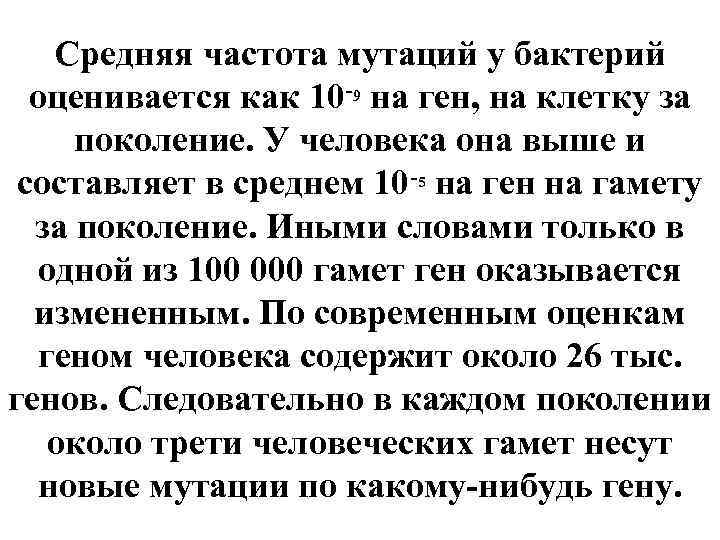 Средняя частота мутаций у бактерий оценивается как 10 -9 на ген, на клетку за поколение. У человека она выше и составляет в среднем 10 -5 на ген на гамету за поколение. Иными словами только в одной из 100 000 гамет ген оказывается измененным. По современным оценкам геном человека содержит около 26 тыс. генов. Следовательно в каждом поколении около трети человеческих гамет несут новые мутации по какому-нибудь гену.
