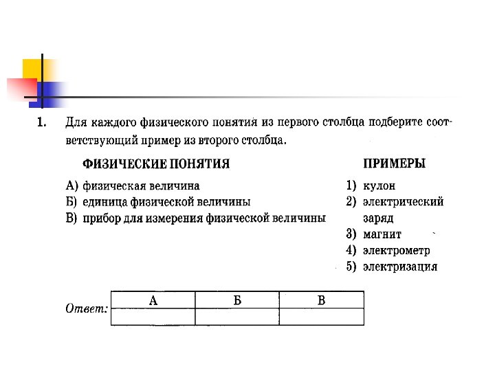 Задания с ответом в виде набора цифр (на установление соответствия) n n n Задание 1 (Физические понятия. Физические величины, их единицы и приборы для измерения) оценивается в 2 балла, если верно указаны все три элемента ответа; в 1 балл, если допущена одна ошибка; в 0 баллов, если допущено более одной ошибки. № 6 (Физические явления и законы в механике. Анализ процессов. ) оцениваются в 2 балла, если верно указаны оба элемента ответа; в 1 балл, если допущена одна ошибка; в 0 баллов, если оба элемента указаны неверно