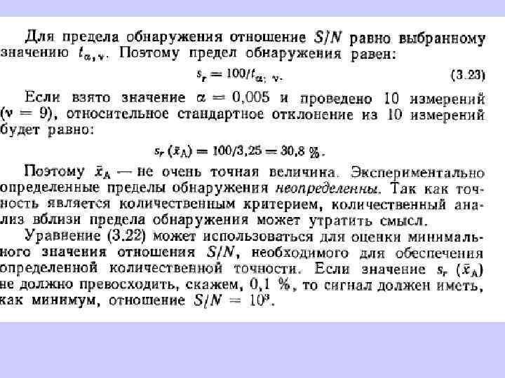 2. Предел обнаружения Cmin - содержание, которое можно обнаружить с заданной достоверностью. Необходимо "увидеть" сигнал определяемого вещества на фоне шумов, т. е. выяснить, значимо ли различие между сигналом фона и сигналом определяемого компонента.
