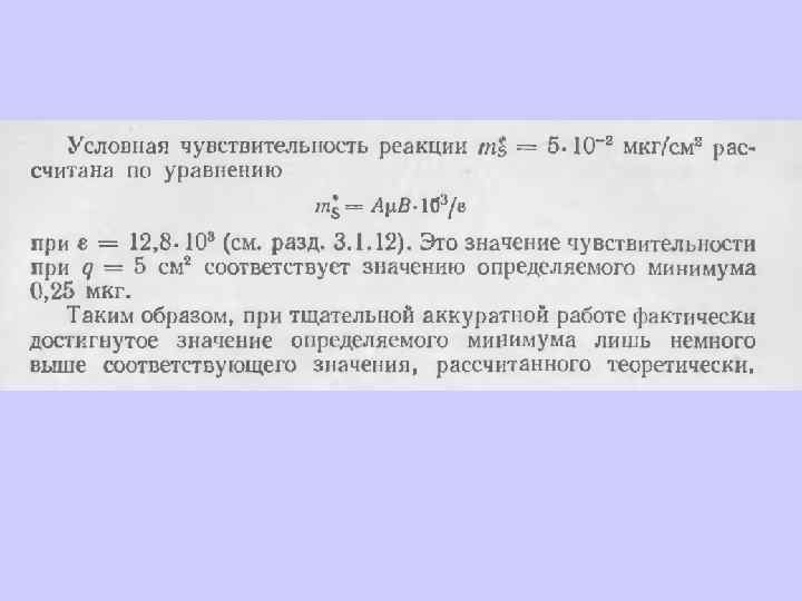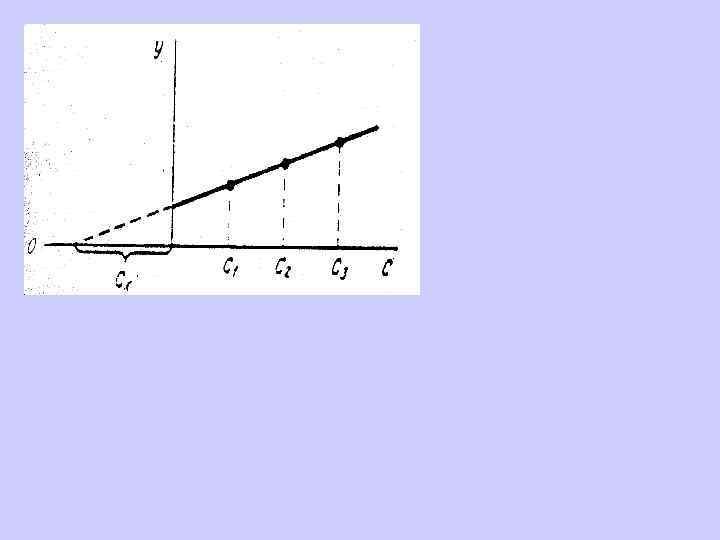 Предел обнаружения Ранее указывалось, что предел обнаружения определяется значением холостого опыта и его случайными отклонениями. Имея уравнение регрессии, также можно экстраполировать значение у при х =0, т. е. У мин = а + t* Sa Х мин = t *(Sa + х ср. *Sb)/(b + t*Sb) чувствительность