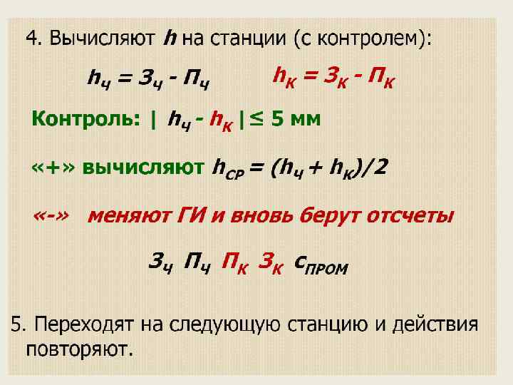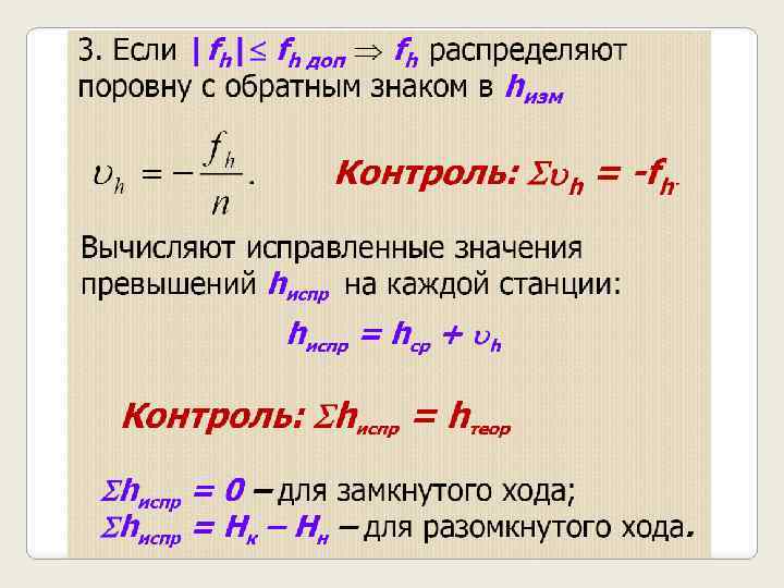 Из рис. 3 следует, что Алгебраическая сумма всех превышений равна превышению между конечными точками хода, т. е. Отметки связующих точек вычисляют последовательно по формуле: Если требуется отметка только конечной точки хода, то ее определяют по формуле Отметки промежуточных точек вычисляют через горизонт прибора. 4