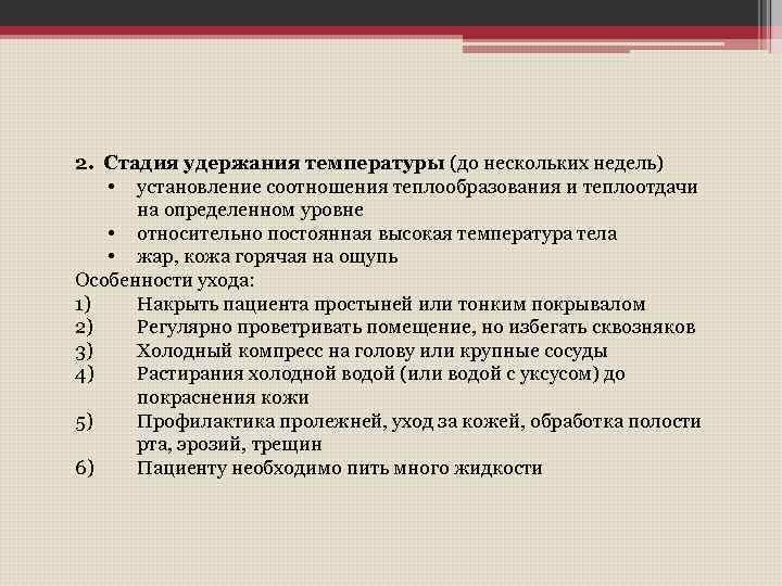 2. Стадия удержания температуры (до нескольких недель) • установление соотношения теплообразования и теплоотдачи на определенном уровне • относительно постоянная высокая температура тела • жар, кожа горячая на ощупь Особенности ухода: 1) Накрыть пациента простыней или тонким покрывалом 2) Регулярно проветривать помещение, но избегать сквозняков 3) Холодный компресс на голову или крупные сосуды 4) Растирания холодной водой (или водой с уксусом) до покраснения кожи 5) Профилактика пролежней, уход за кожей, обработка полости рта, эрозий, трещин 6) Пациенту необходимо пить много жидкости