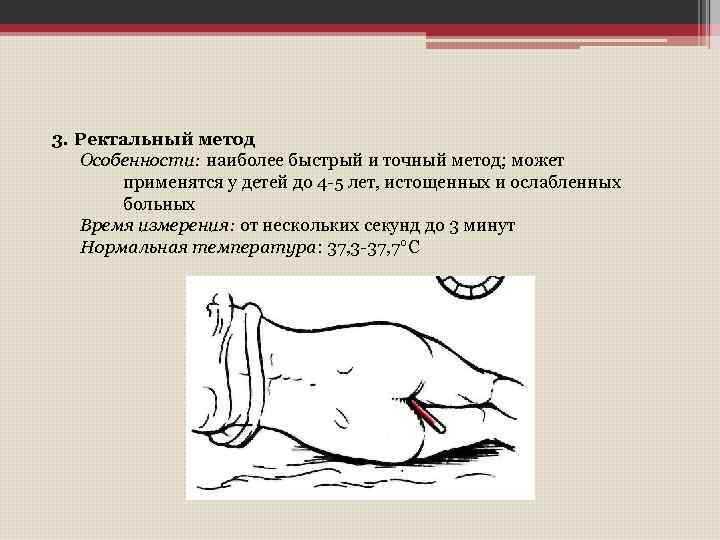 3. Ректальный метод Особенности: наиболее быстрый и точный метод; может применятся у детей до 4 -5 лет, истощенных и ослабленных больных Время измерения: от нескольких секунд до 3 минут Нормальная температура: 37, 3 -37, 7°C