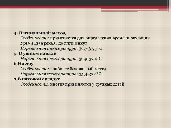 4. Вагинальный метод Особенности: применяется для определения времени овуляции Время измерения: до пяти минут Нормальная температура: 36, 7 -37, 5 °C 5. В ушном канале Нормальная температура: 36, 9 -37, 4°C 6. На лбу Особенности: наиболее безопасный метод Нормальная температура: 35, 4 -37, 4°C 7. В паховой складке Особенности: иногда применяется у грудных детей