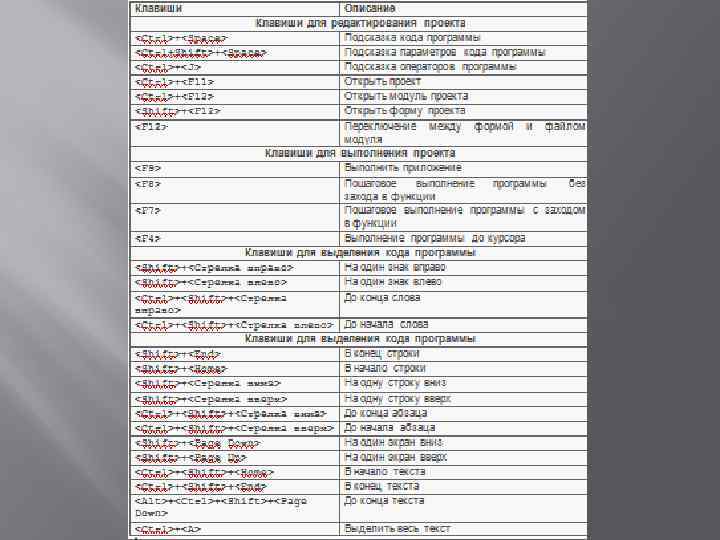 Команды этого меню осуществляют работу с файлами и предоставляют доступ к операциям создания (New) новых форм (окон) и приложений, открытия (Open), сохранения (Save) и закрытия (Close) файлов и проектов, печати текстов программ (Print) и добавления заголовочных модулей (Include), то есть файлов с расширением h. Обратите внимание на то, что перед некоторыми командами меню находятся значки (иконки). Эти же значки изображены на кнопках быстрого запуска. Благодаря такому соответствию можно без труда понять назначение быстрых кнопок. Кроме того, справа от некоторых команд меню написано соответствие команд горячим клавишам, то есть клавишам, с помощью которых вызывается данная команда. Еще правее этих надписей кое-где имеются треугольные стрелки, указывающие на то, что данная команда имеет расширенные возможности, которые становятся доступными после наведения на эту стрелку курсора мыши.