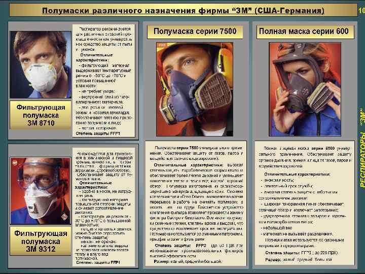 Респиратор универсальный РУ-60 М Предназначен для защиты органов дыхания от вредных веществ, присутствующих в воздухе в виде газов, паров и аэрозолей. Применяются с патронами марок: А- для защиты от аэрозолей, паров органических соединений (бензина, керосина, ацетона, бензола и его гомологов, спиртов, эфиров кроме низкокипящих и плохо сорбирующихся веществ, хлор- и фосфорорганических ядохимикатов; В- для защиты от аэрозолей, кислых газов (сернистый ангидрид, хлористого водорода и др. ), хлор- и фосфорганических ядохимикатов; КД- для защиты от аэрозолей, аммиака и сероводорода; Г- для защиты от аэрозолей, паров ртути. Не рекомендуется применять для защиты органов дыхания от высокотоксичных веществ (типа синильной кислоты, мышьяковистого и фтористого водорода). ГОСТ 17269 -71 Комплектуется: полумаска с трикотажными обтюратором; клапаны вдоха и выдоха; фильтрующе -поглощающих патроны; сменные патроны Технические характеристики Рекомендуется использование при концентрациях вредных веществ в воздухе, ПДК………. . . ………………. . … 10 -15 Коэффициент проницаемости по аэрозолю с дисперсностью 0, 3 мкм (МТ), %, не более………………… 1 Коэффициент подсоса по аэрозолю с дисперсностью 0, 3 мкм (МТ), %, не более…………………. . 2 Сопротивление постоянному потоку воздуха при 30 л/мин, Па (мм вод. ст. ), не более ………………… 78, 4 (8) Масса, кг, не более …………………………………. . . ……… 0, 34