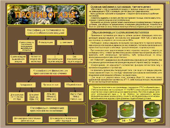 ФИЛЬТРУЮЩИЕ ПРОТИВОГАЗЫ Предназначены для индивидуальной защиты органов дыхания, глаз, лица человека от воздействия опасных химических веществ. Принцип действия противогазов основан на изоляции органов дыхания от окружающей среды и очистке вдыхаемого воздуха от аэрозолей и паров токсичных веществ в фильтрующе-поглощающей системе. Могут применяться при высоких концентрациях ОХВ в воздухе в виде пара (до 1% объёмных в зависимости от типа противогаза) и аэрозолей (превышающих ПДК до 10000 раз).