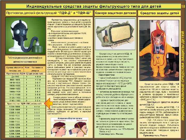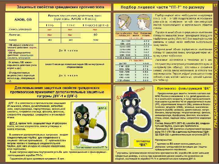 Гражданский противогаз ГП-7, -7 ВМ. Предназначен для защиты органов дыхания, лица, глаз от воздействия отравляющих веществ, радиоактивных паров и аэрозолей и бактериальных (биологических) средств. Обеспечивает высокоэффективную защиту: -от паров отравляющих веществ нервно-паралитического действия (типа зарин, зоман и др. ) до 6 часов. -от паров отравляющих веществ общеядовитого действия (типа хлорциан, синильная кислота и др. ) до 6 часов. -от капель отравляющих веществ кожно-нарывного действия (типа иприт и др. ) до 2 часов. -от радиоактивных паров и аэрозолей. Обеспечивают эффективную фильтрацию жидких и твердых аэрозолей любых размеров, включая минимально возможные, наиболее проникающая фракция 0, 3 мкм. Комплектуется: лицевая часть МГП, МГП-В (для ГП-7 В и ГП-7 ВМ - с приспособлением для питья) фильтрующе-поглощающая коробка ГП-7 К; незапотевающая пленка; утепленный манжет; сумка. Технические характеристики Сопротивление дыханию при расходе воздуха 30 л/мин, Па (мм вод. ст. ), не более ГП-7, ГП-7 В………………………………. . 180 (18) ГП-7 ВМ…………………………………. 150 (15) Масса, кг, не более ГП-7, ГП-7 В ………………. . . …. …………………. . …. 0, 9 ГП-7 ВМ………………………. …… 0, 95 Температурный режим………………………………. от – 40 до +60 Количество ростов…………………. . ………………………. . . 3