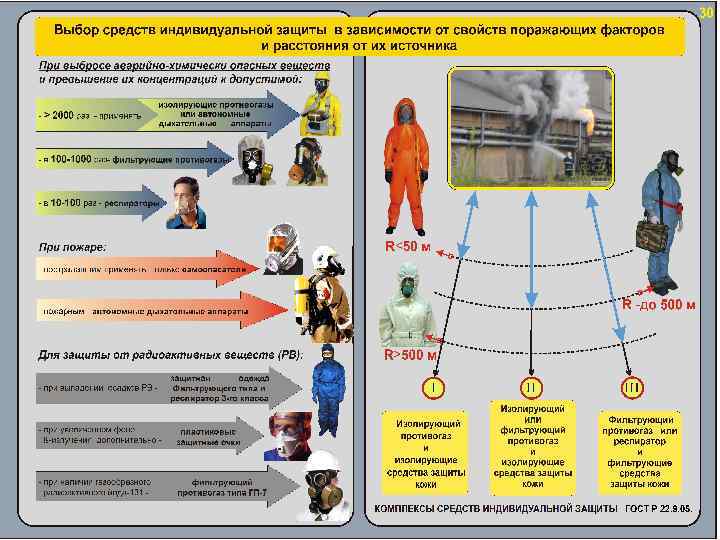 Выбор и эксплуатация СИЗ Во-первых, спрогнозировать содержание кислорода в зараженном воздухе. Если содержание кислорода составит более 18% (по объёму), то возможно использование фильтрующего противогаза или фильтрующего самоспасателя, а если менее – только ИДА (изолирующего самоспасателя). Во-вторых, необходимо оценить вероятность попадания капель АХОВ на внешнюю поверхность лицевой части фильтрующего противогаза или ИДА. Если такая вероятность достаточно велика то следует сопоставить продолжительность использования СИЗОД с временем защитного действия под каплями АХОВ. В-третьих, необходимо определить дозы аэрозолей и паров (газов) АХОВ, которые могут поступить в органы дыхания за время работы в зараженной атмосфере в результате проницаемости противоаэрозольного фильтра и подсоса под лицевую часть. Если попадет больше предельно допустимой дозы, то возможно использование только ИДА с избыточным давлением в подмасочном пространстве. В-четвертых, необходимо оценить время защитного действия коробки фильтрующего противогаза по парам веществ и сопоставить его с продолжительностью выполняемых работы. Если время защитного действия больше продолжительности предполагаемой работы, то возможно использование фильтрующего противогаза, а если нет – то только ИДА. Изолирующие дыхательные аппараты необходимо использовать также во всех случаях, когда не удается вещество идентифицировать.