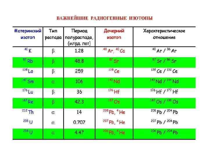 методы изотопного анализа 1) Rb-Sr метод 3 а) Pb-Pb метод 5) La-Ce метод 7) La-Ba метод 2) Sm-Nd метод 3 б) U-Pb метод 6) Lu-Hf метод 8) Ca-K метод 3) U-Th-Pb метод 4) Re-Os метод 9) неравновесный уран