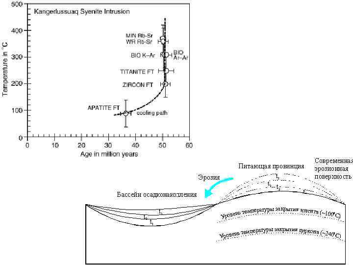Влияние геологических процессов на K-Ar систему минерала. • • • Аргон в минерале размещается в дефектах, междоузлиях и является относительно подвижным. Естественно, что любое геологическое воздействие отражается на распределении аргона. При этом не всегда радиогенный изотоп сохраняется и определение возраста становления оказывается не возможным. Но с другой стороны, эти вторичные геологические процессы оставляют след в виде перераспределения изотопов аргона, что позволяет фиксировать время их проявления. Следует подчеркнуть, что любые изотопные датировки и возраста отражают время с момента закрытия изотопной системы. Если бы этого не было, все образование имели бы одинаковый возраст ПЛАВЛЕНИЕ. Например, при плавлении минерала предыдущая информация о возрасте стирается. После охлаждения начинает накапливаться радиогенный аргон, который указывает время после плавления. Деформации. Сложный процесс, влияющий на минералы в зависимости от интенсивности деформационного процесса. Флюиды. Новообразованные минералы. Тектоника, микротектоника, оценка пригодности минералов, анализ через лазерное испарение. Метаморфизм. Контактовый метаморфизм: ШТОК внедряется в протерозойскую породу. Как себя ведут K-Ar датировки по мере удаления от штока. График. РАСПРЕДЕЛЕНИЕ минеральных ДАТИРОВОК с учетом размеров минералов температурные свойства минералов (роговая обманка, мусковит, биотит, полевой шпат.