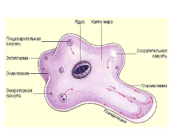 Империя клеточные Надцарство эукариоты Царство животные Подцарство простейшие (PROTOZOA) или одноклеточные. Включает в себя 7 типов. Тип Саркомастигофора (Sarcomastigophora). Включает около 25000 видов. Подтип Саркодовые (Sarcodina). Форма тела непостоянная. Органеллы передвижения – псевдоподии раз-личной формы. Жгутики, если имеются, то на кратковременной стадии жизненного цикла (у гамет, агамет, зооспор). У большинства видов только бесполое размножение. Большинство свободноживущие, некоторые паразиты Класс Корненожки (Rhizopoda). Отряд ·Амебы - Amoebina Амеба дизентерийная (Entamoeba histolytica)