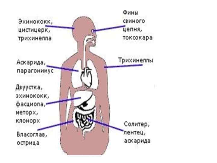 А) механическое воздействие: пузырь эхинококка сдавливает окружающие ткани, кишечная непроходимость при наличии аскарид, печеночный сосальщик повреждает желчные ходы и может возникнуть желтуха. Б) поглощение пищи – истощение организма хозяина. В) аллергические реакции. Это частое явление, особенно характерно для ленточных червей. Г) интоксикация: при малярии – приступы. Д) могут способствовать проникновению болезнетворных микроорганизмов (повреждая слизистые, кожу, или переносчики).